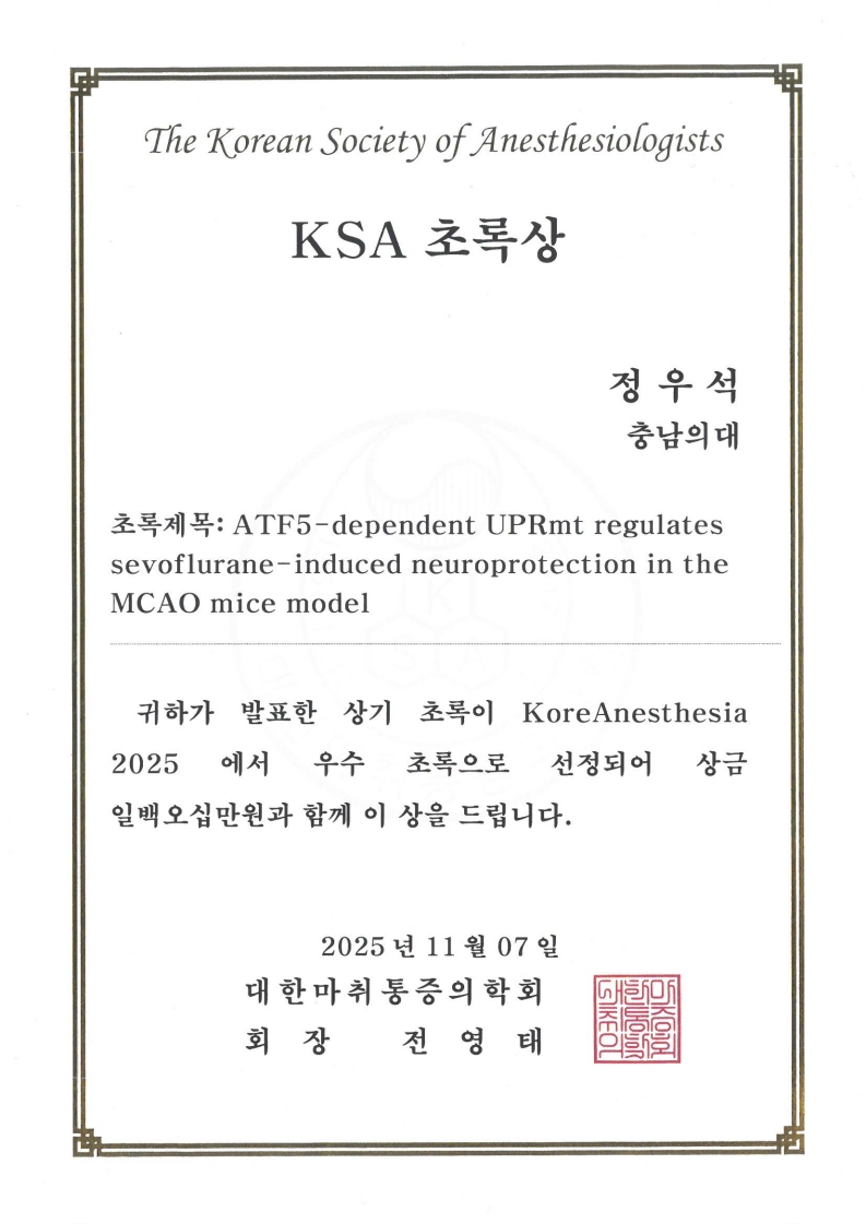 정우석 교수, 대한 마취통증의학회 KSA 초록상 수상!
